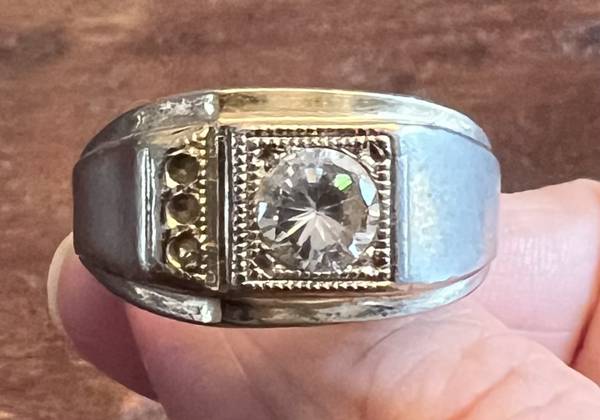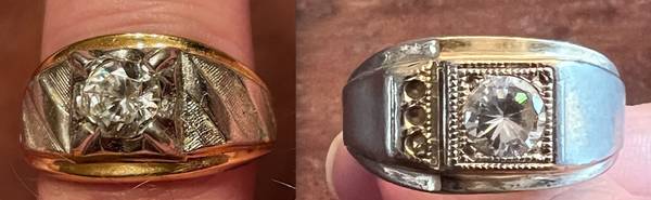 Two men's rings, both 14 KT gold electroplate with large cubic zirconia (?) stones. I'm sorry, I do not know sizes (similar if not the same though.) Asking $10 each or both for $15.