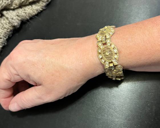 Vintage gold clasp bracelet with six separate connected sections. Different shapes, each with open stripes allowing wearer's skin to show through, and each embellished with diamond-colored gemstones. Possibly from the 1950s or 60s. Shows age-appropriate wear. North Silver Spring, near Colesville and Burtonsville.