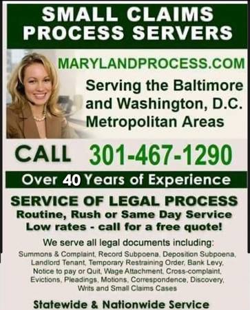 Tags: process service, process server, process servers, Anne Arundel County, Baltimore, Calvert County, Charles County, Howard County, Montgomery County, Prince George's County, Saint Mary's County, Southern Maryland, Nationwide Service, Waldorf, Court Services, Order of Protection, Subpoena, Summons, Complaints, Divorce, Family Court, Landlord Tenant, Eviction, 30 Day Notice, Petition, Court Filing, Skip Tracing, Defendant, Petitioner, Plaintiff, Respondent, Locate, Notary, Affidavit, Rates, Affordable, Custody, Visitation, Attorney, Lawyer, Private Investigations, Landlords, Property Managers, NAPPS, Evictions, Evicting, The Corporation Trust Company, Maryland Process Server
