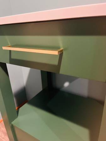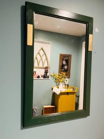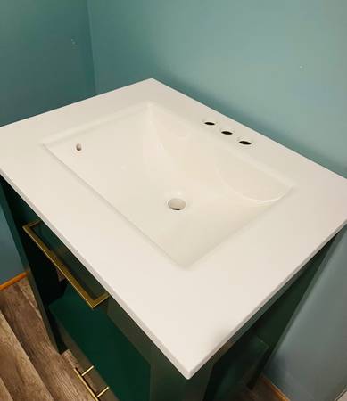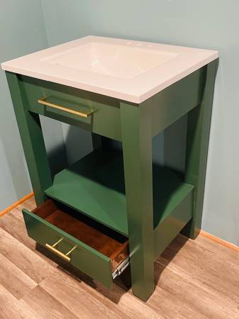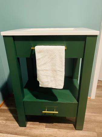 24” Forest green vanity with white cultured marble and matching mirror. Bottom drawer. Sink not attached. Mirror is 26” x 24”. Vanity is 24 1/2” wide, 19” deep and 35”.