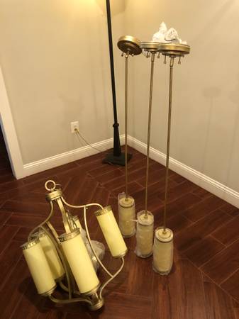Triarch Maestro dining room 6-light chandelier with a hand-painted silver / gold leaf finish and cream-colored glass shade in perfect condition. We remodeled and are using new fixtures. Fully working condition, ready to hang.