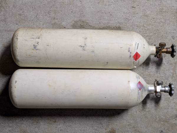 $20.00 each. Painted chromium-molybdenum steel gas tanks (DOT-3AA2250). Labeled: "Compressed Natural Gas CH4". Exterior in very good condition (no rust visible). Valves are currently shut. Tanks haven't been used in a long while and will need to be recertified.