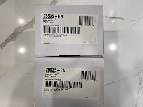 Two Kohler Robe Hooks - Industrial Style - Polished Chrome Part: K-26535-CP I ordered Brushed Nickel, but received Polished Chrome. The boxes are mis-labeled.