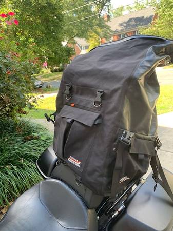 Almost perfect shape. Black color-not faded. Used for a 4 day trip to the Dragon in 2015. Not used since. Paid $250 from store. No wear and tear. All connections for straps, etc intact. Size is roughly 16 wide and 10 inch deep and 24 inch high. Good for HD backrest connectons or any other sturdy sissy bar. It may be waterproof. Cant find brochures to confirm.