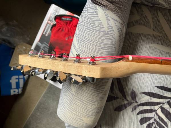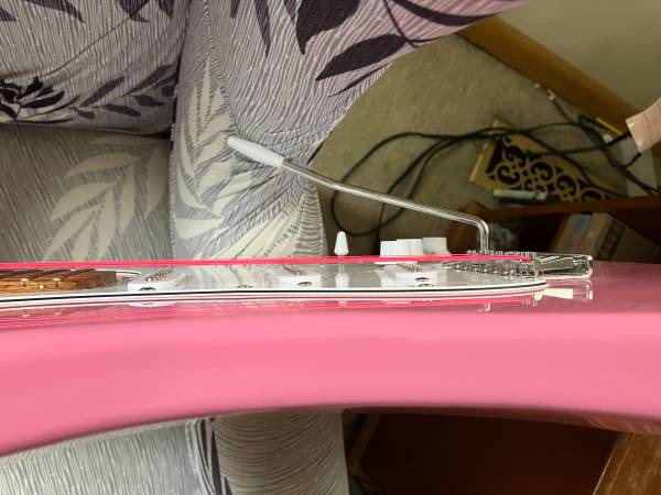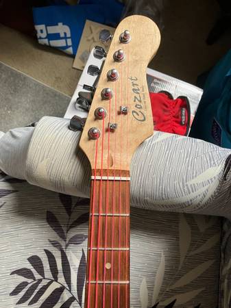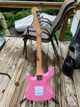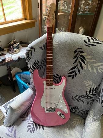 Selling this "Strat Style" Pink Electric Guitar made by Cozart. Great beginner guitar for those who like the Pink Panther or Barbie theme. This one was hardly played. It is like new condition. Comes with a new set of DR Neon pink electric strings NPE-10. Strings are sized 10,13,17,26,36,46. According to various reviews using the DR Neon coated strings, the pink coating will wear off in short order, especially on the high E and B strings.