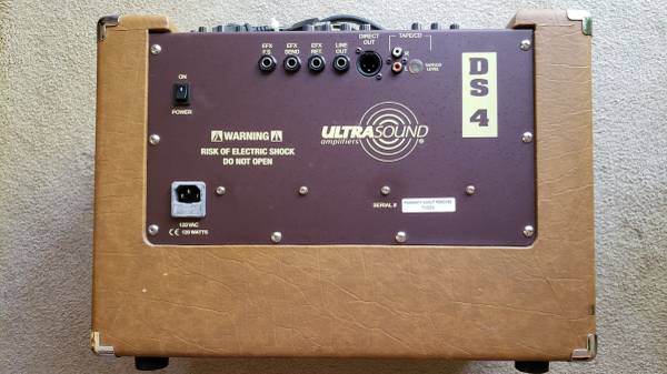 This is a high-quality, two-channel amplifier designed for acoustic guitar (or mandolin, etc.) and vocals, for small to medium-sized spaces. Made by UltraSound Amplifiers (West Des Moines, Iowa), now defunct (were later sold by Dean Markey). Original price of this amp was about $600. This unit had only light home use for just a few years, and since then has been stored indoors and dry. Excellent condition.