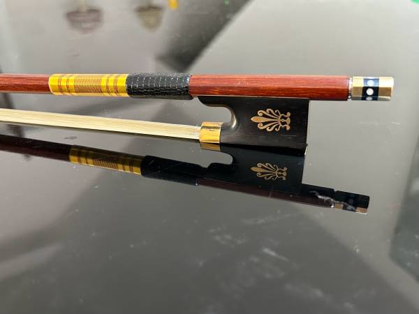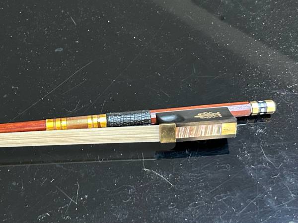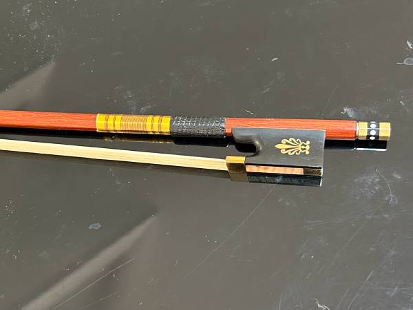 Brand new 4/4 violin bow, wood/horsehair, fancy appointments. Great bow to have as a spare.