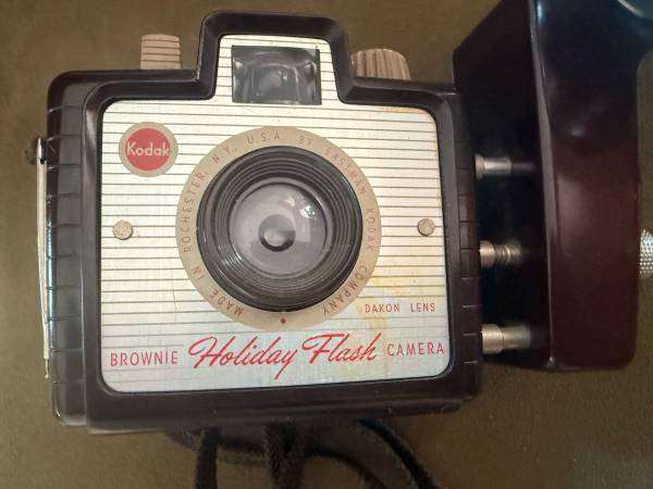 This is a very good example of one of Kodak’s very popular Brownie Holiday series of the 1950’ and 60’s. It took type 127 film, had a fixed focal length and aperture. This one includes the original Midget flash but needs AA batteries and I will include one bulb. This makes a great shelf display piece. It does have a small chip in the ring around the lens, please see the picture.