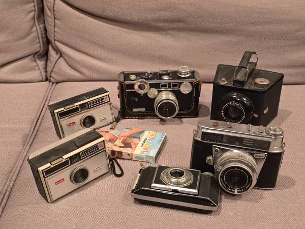 Nice little collection of vintage cameras from the 1930s–1960s. Great for collectors, decorators, or anyone into old-school photography gear.