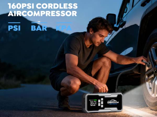 💨AIR COMPRESSOR JUMP STARTER WITH TIRE INFLATOR :Featuring professional tire pressure monitoring and automatic shut-off, this portable tire inflator supports 4 preset inflation modes for fast, safe inflation of car tires, motorcycle tires, bicycles, air mattresses and pool floats. As a reliable jump starter with air compressor, it delivers up to 160 PSI maximum pressure with three selectable units (PSI/KPA/BAR). The clear LCD display shows real-time pressure readings, battery level, and active mode - making this portable jump starter for car your ideal inflation solution.