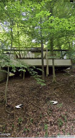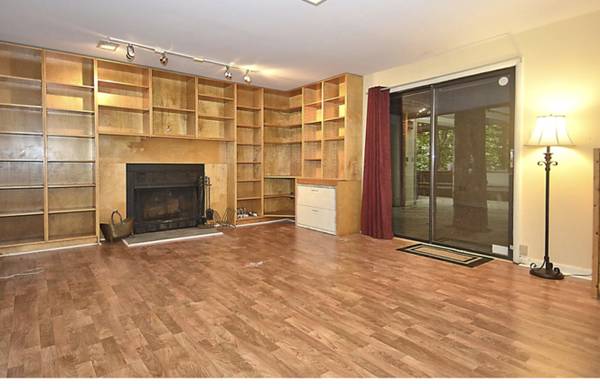 Private entrance, large deck, two rooms, large main room -working fireplace, sliding doors, big window, double racked closet, carpeted smaller room, large pretty empty unfinished area for storage. About 300 sq ft finished area, 100 unfinished storage area. Updated bathroom, Private deck bigger than 400 sq ft. Just had wood repairs, painted.