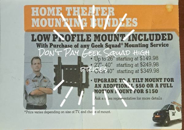 - Regular TV Mount Bracket juts add $50-$100 depending on size of TV