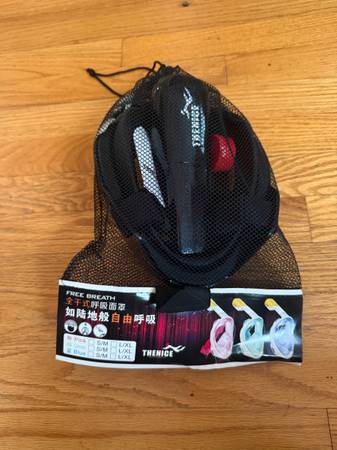 This is a Thenice full-face snorkel mask, also known as a "Free Breath" mask. This type of mask is designed for surface snorkeling and allows the user to breathe naturally through both their nose and mouth. It has never been used and basically new. Size is S/M