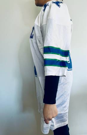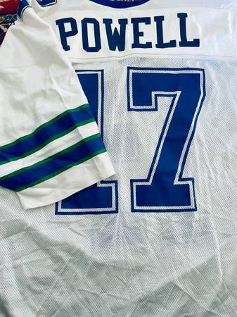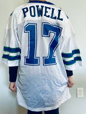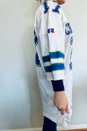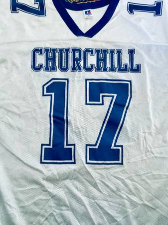 Game-worn Russell Athletic varsity football team uniform shirt. Winston Churchill High School (Potomac Maryland). Blue, white and green. Size is Extra Large. There are some stains (dirt?) from use, but the material is not ripped or torn. Made in USA.