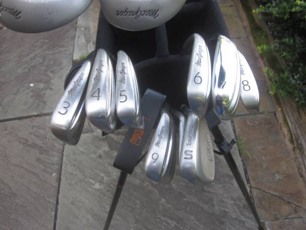 3,4,5,6,7,8,9,PW,SW Tourney+ FMT blade style irons (#7 is a similar MacGregor V-foil with graphite shaft. SW is Tourney)