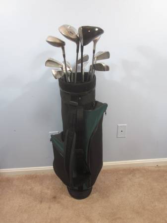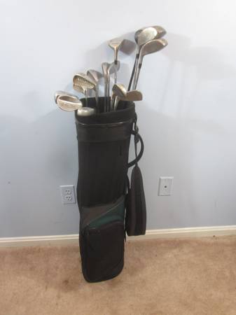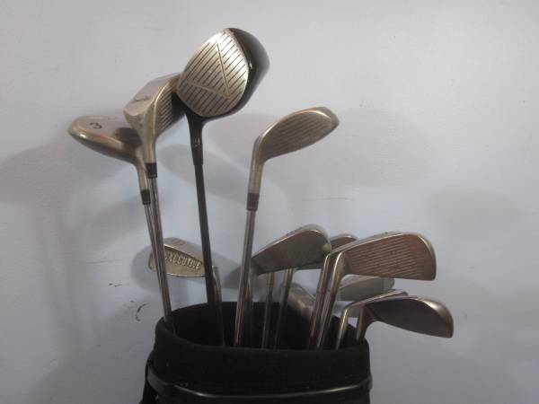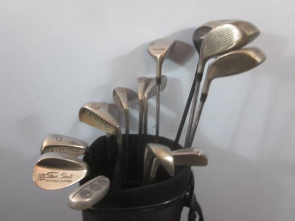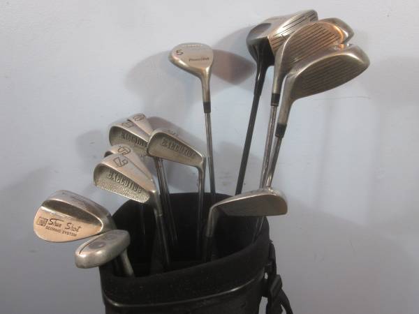 1,3,5 Powerbilt Dynasty drivers 3,4,5,6,7,8,9,PW Spalding Executive wide sole, cavity backed irons Custom Golf Sure Shot sand wedge Putter Carry bag Good condition **** Bonus driver- Hammer Long...