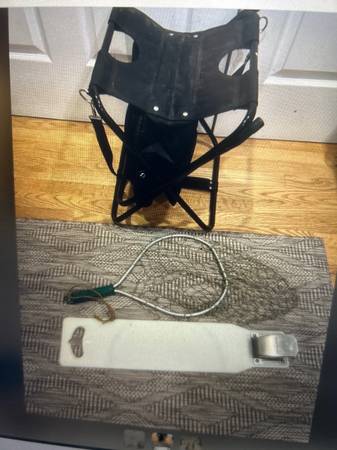 Four fishing poles with reels, scoop net, new fish scaler, and new folding seat with storage and should strap.