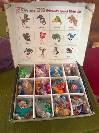 The set contains 12 different Teenie Beanie Babies. They are in a box in good condition. Each Beanie Baby is in wrapping and mint condition. The names of the included toys are Antsy, Chip, Claude,...