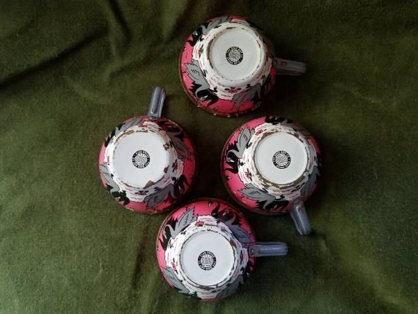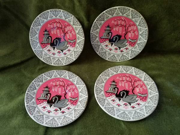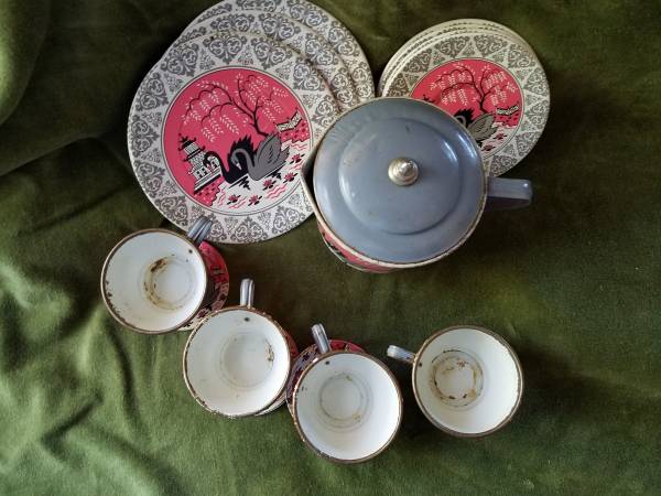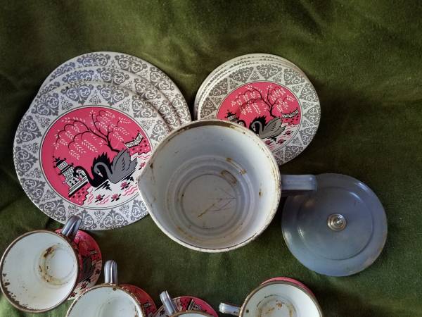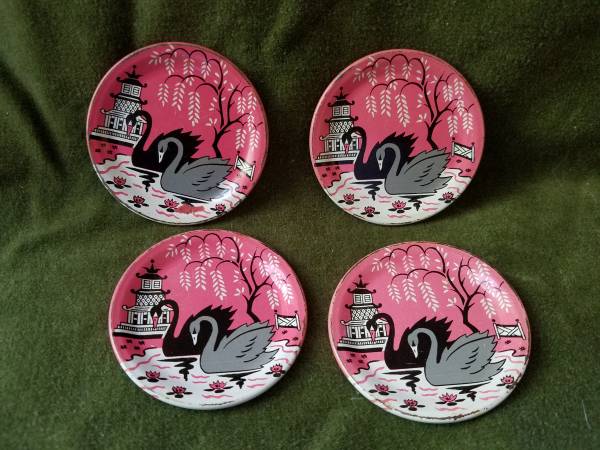 Service for Four The Ohio Art Company 1950s Pink Willow or Pink Swans tin Tea Set. Tea Pot, 4 large plates, 4 small plates, 4 cups with 4 saucers. Please see photos for condition, mostly very good for a toy of this age. I have not tried to clean the rust marks from inside the cups. Would make an adorable holiday gift with no supply chain issues! Reduced from $80.