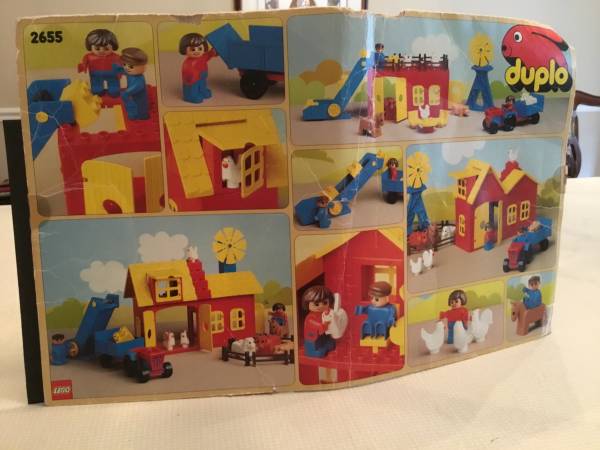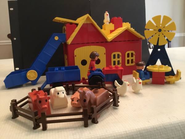 Vintage Duplo Play Farm from 1985, set #2655, 100% complete by inventory of parts (52 parts,) all parts and figures in very good to excellent condition (minor scratches on some bricks and the conveyor belt sometimes needs a little assist,) no instructions but have part of the box with ideas for different assemblies. On eBay, these sets range from $60 plus S&H (plus they are incomplete) to $129 and above. My set is clean, one owner, from a smoke free, pet free home.