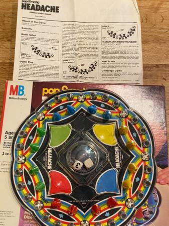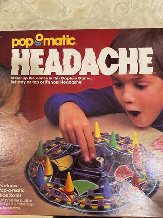 Like new, Milton Bradley game: Headache For ages 5 and up. Features a fun pop-o-matic dice roller. Game instructions and all pieces included.