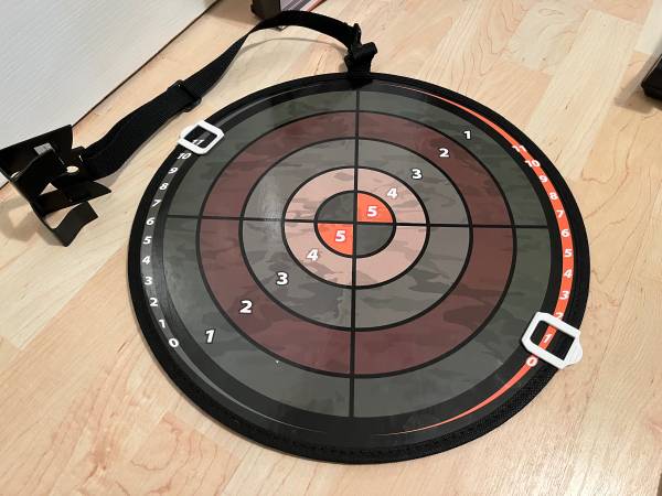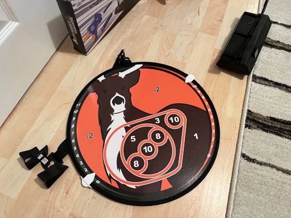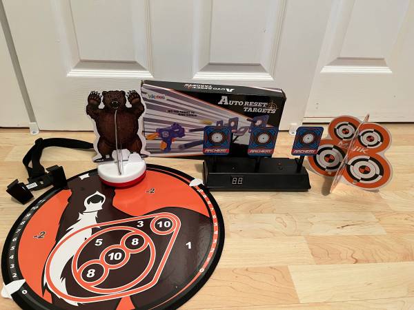 Shooting targets for nerf guns or blusters in excellent condition. Two of them are electronic and one has a hook to hang over the door with two different target discs.