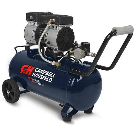 This 8-gal Campbell Hausfeld Air Compressor helps you on a wide variety of projects. It features an oil-free pump that's low maintenance and a dual piston pump system that produces up to 25% more air than standard 1.0 HP compressor motors. It's also quiet at just 65 dBA, one of the quietest compressors you'll find. It's also easy to move where you need with a rubber-grip steel handle and large wheels.