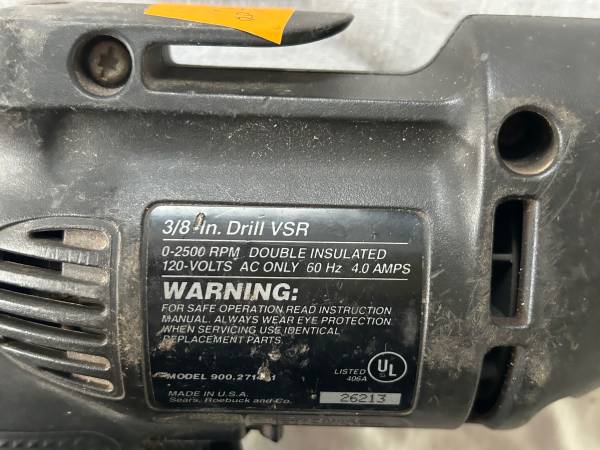 CRAFTSMAN INDUSTRIAL 3/8" VSR DRILL. MODEL 900271441- Tested & Works! Variable speed, reversible, 4.0 Amp Cash $30