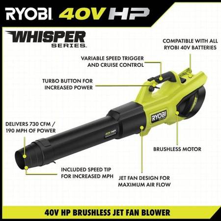 The RYOBI 40V HP Brushless 730 CFM Blower Kit has more power than a 27cc gas blower, delivering exceptional performance without the hassle of gas. 40V HP technology combines a powerful brushless motor, advanced electronics, and lithium technology to deliver 730 CFM and 190 MPH, making it ideal for damp leaves, heavy yard debris, and compacted grass. Achieve 1.5 hours of runtime using a 40V 6Ah battery or 1 hr using a 4AH battery. BTW, I do have both batteries and chargers in stock.