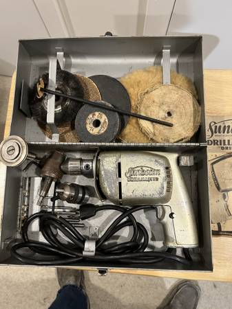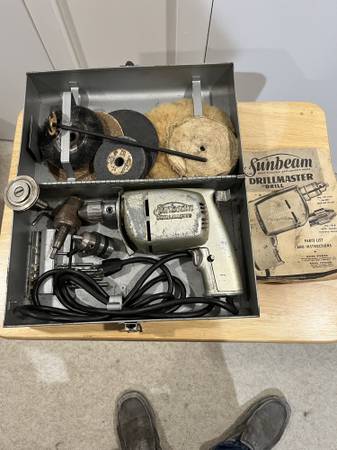 SUNBEAM DRILLMASTER KIT, ORIGINAL VINTAGE 1950'S, MOST ACCESSORIES INTACT, ORIGINAL CASE, DRILL IN OPERATIONAL CONDITION, WITH ORIGINAL OWNERS/OPERATION MANUAL. OVERALL FAIR CONDITION, WAS CERTAINLY USED (BY ME) THROUGH THE YEARS. MORE OF A VINTAGE INTEREST I SUPPOSE. ADDITIONAL CHUCKS INCLUDED, JACOB'S KEYED CHUCK AND A KEYLESS CHUCK AS WELL. WILL ENTERTAIN REASONABLE OFFERS.