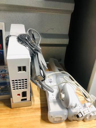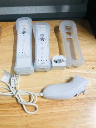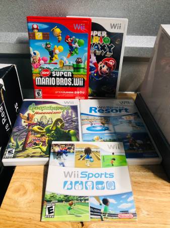 Wii Console, Tray, Sensor, 2 Remotes and Nunchuk and 5 Games Wii is working and in very good condition.