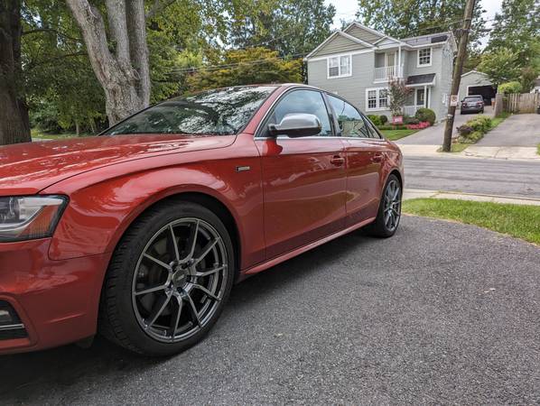 I used to drive a 2013 Audi S4. I replaced the OEM wheels with after market Flow One brand. They are 19×8.5. All in very good condition, no structural damage. One of the rims outer lip is bent, no crack or damage to the structure. I know because, I drove with the wheel over a year and did not lose any air or no problem balancing the wheel. I paid $350 per wheel new, selling them for $200 each or a total of $800. Will only sell all 4 together. Please see the pictures. I understand that folks may be skeptical when reporting a damage and minimizing the effect but, I cared for my Audi and you are welcome to bring a tire to try it. The size of my tires were 255/35/19