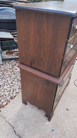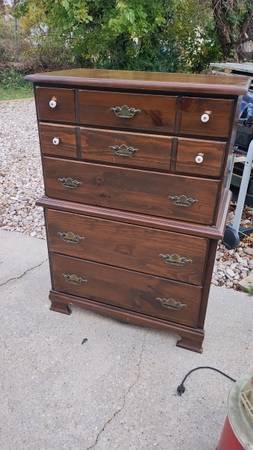 One wood dresser 5 drawers All knobs included Sturdy and functional. Tongue and groove See pics for condition