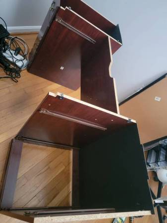 The desk is missing one of the sliding cabinet sections.
