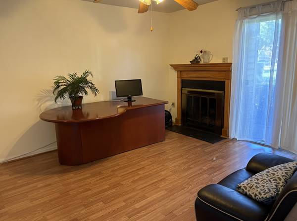 The spacious living room features a fireplace and sliding door leading out to a personal patio. Large bathtub in bathroom. Light and bright with wood floors throughout. Walk-in closet in bedroom and exterior large storage area.