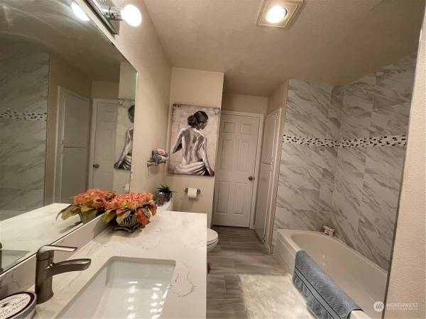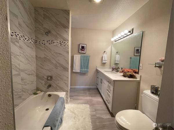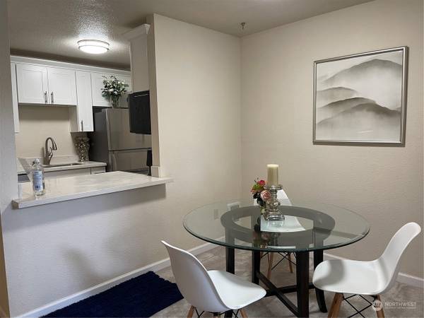Welcome to Salish Village. This updated 1 bedroom/ 1 bath condo with large walk-in closet, bright with covered deck. Walk to shopping, restaurants and luxurious Totem Lake mall, Evergreen Hospital, easy access to I405. Once inside, you will be greeted by spacious living room w/wood burning fireplace, covered deck. Large bedroom and spacious bathroom with tub! Enjoy community amenities - game room, in-ground pool, cabana with spa, sauna. 4 closets in the unit. 1 Designated parking, No rental cap. Pet friendly.