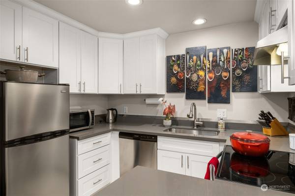 Resort-style living in 6001 complex, with amenities galore. Gorgeous updated townhome, Move-in ready! Bright and light interior features new white soft close cabinets in the kitchen, gray quartz countertops & backsplash and SS appliances. Full bath with ceramic tile floors, newer lighting and quartz vanity.Enjoy the convenience of a full size W/D in the unit. Perfect deck/balcony for entertaining. Extra lockable Storage in attached carport. The complex features 4 swimming pools, 3 lakes, acres of trails, clubhouse and gated entry. Ample open parking..Lots of natural light from the slider & tall windows in main living area. Wake up to the lake view from the bedroom. Carport with storage is just outside front door. No rental cap.