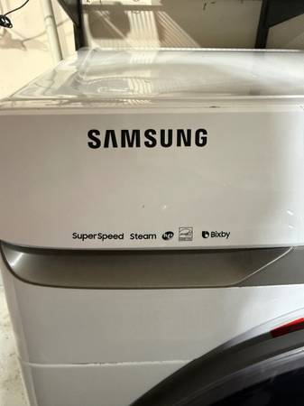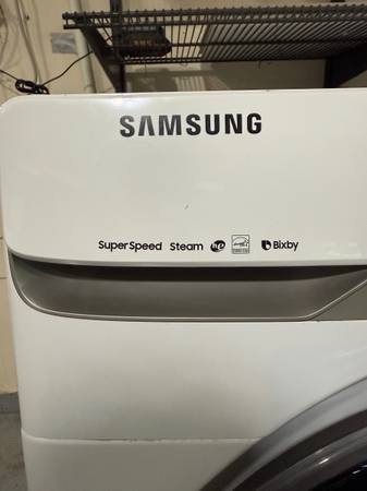 SAMSUNG Washer, front load, high efficiency, white SAMSUNG Dryer, front load with multisteam and moisture sensor, white Depth with door open: 52.6"