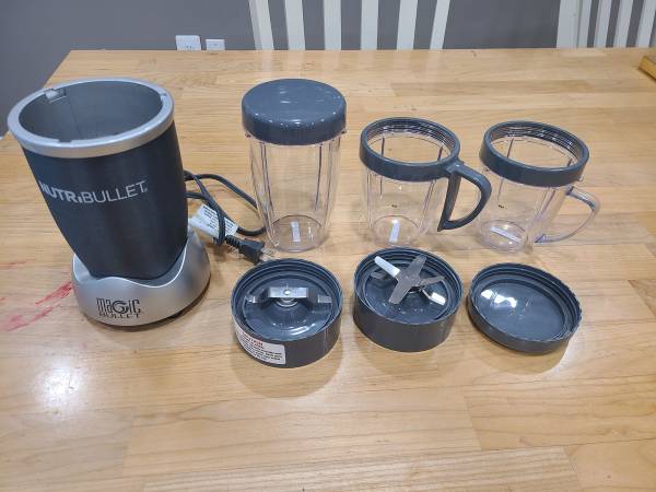Magic Bullet Nutri Bullet complete set. Includes the blender, two different blade caps, two storage caps, two finishing rings, and 3 containers as shown. Works great $35 cash only, pick up only.