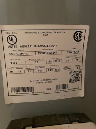 Never Installed, AO Smith Signature - 74 gallon Water Heater Fuel Type - Propane 5" out flow to 4" exhaust vent Thermostat: Honeywell Includes 30" aluminum drain pan Out of box. Never installed....