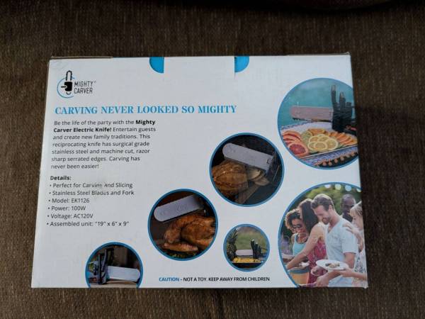 Think of an electric carving knife. Now imagine if it was shaped like a chainsaw. That’s the Mighty Carver — a unique way to bring life and lasting memories to your family get-togethers and holidays.