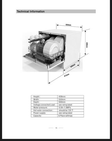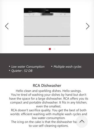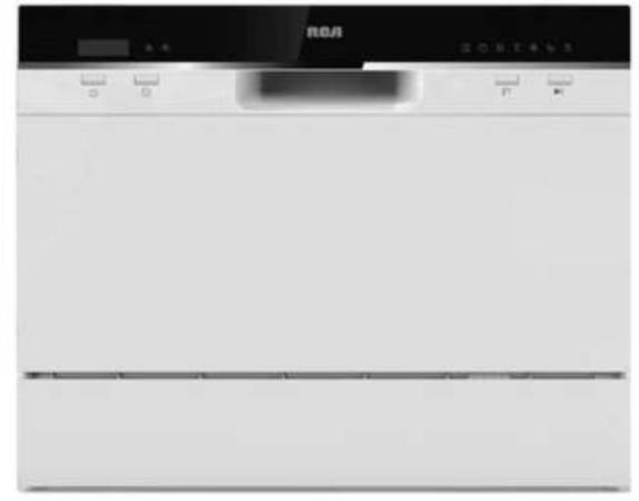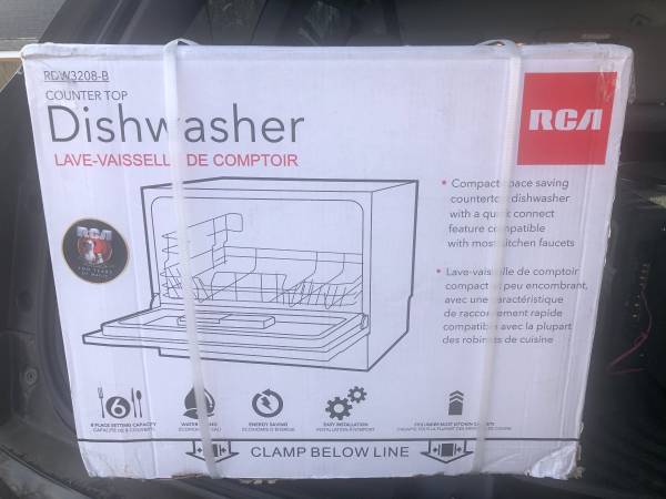 Brand new RCA RDW3208-B countertop dishwasher. Do not confuse this with the one at Home Depot that doesn’t have a digital readout. It’s compact and portable. It can also be custom installed permanently to existing water supply line and drain pipe if you choose. Width 21.65 inches. Height 17.24 inches. Length door closed 19.69 inches. Length door open 31.97 inches.