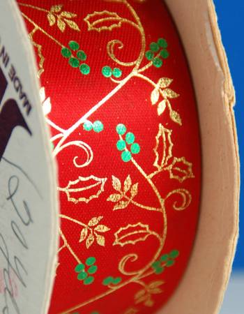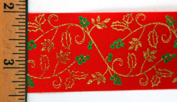 One spool of Designer Dispatch "Holiday Red" Ribbon. Length: 21yd 18in Width: 1 7/16in The ribbon features a printed holly vine pattern with gold stems and leaves and green berries. Note: The rulers...