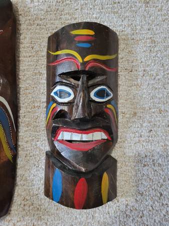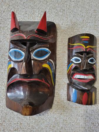 2 Vintage Mexican Wooden Masks Hand carved. Wood. Purchased in Mexico in the early 1990's Smoke free home Masks measure approx 17x10 in and 13x6 in