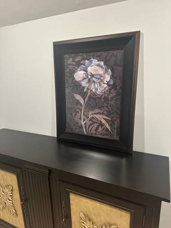 Housed in a wide, beveled black frame with bronze edging, the artwork has a sophisticated finish and dramatic presence on the wall. Ideal for a dining room, hallway, or formal sitting area.
