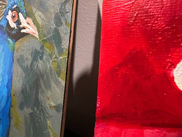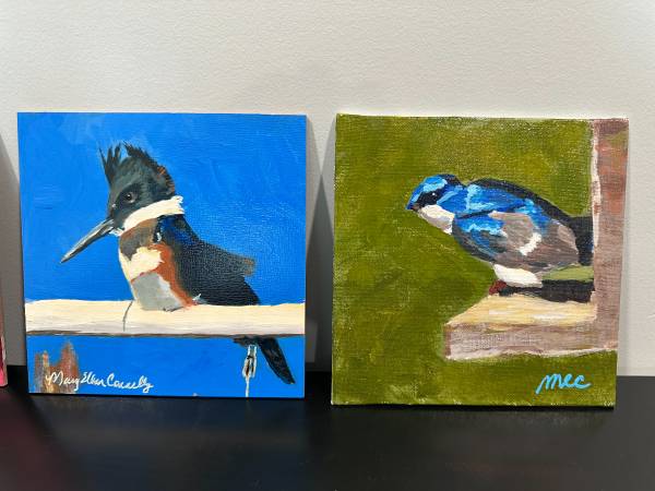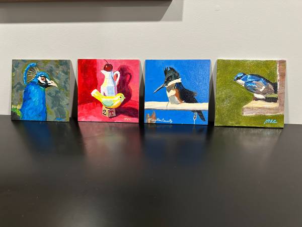 This charming set of four original acrylic paintings by artist M.E. Connelly offers a unique blend of vivid color and expressive style. Each piece is signed and dated 2024, showcasing subjects ranging from wildlife (including a vibrant peacock and two detailed bird portraits) to a bold still-life composition. Perfect for gallery walls, office spaces, or gift giving.
