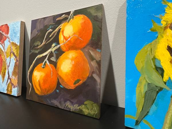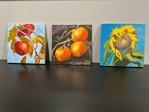 This vibrant trio of original acrylic paintings by artist M.E. Connelly captures the warmth and richness of fall harvest scenes with striking detail and color. Each 6” x 6” panel is hand-painted and signed by the artist, featuring bold compositions of apples, persimmons, and a vivid sunflower against a bright blue sky.