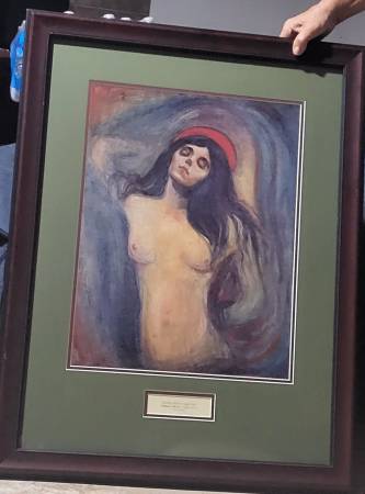 Print on canvas reproduction of Edvard Munch "Madonna" painting surrounded by a olive green border with a caption beneath with the description of the painting inside a brown frame. The original painting was painted around 1893 and is located at the Munch museum in Oslo, Norway.