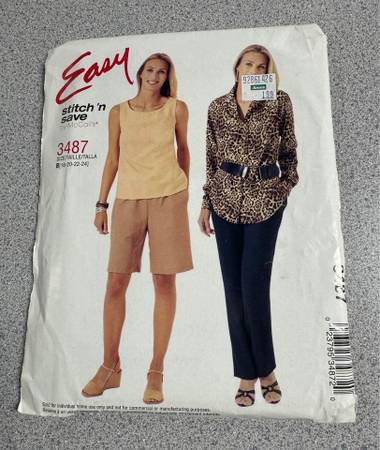 Pattern 3487 for shorts, pants and blouses is size 18, 20, 22, 24.