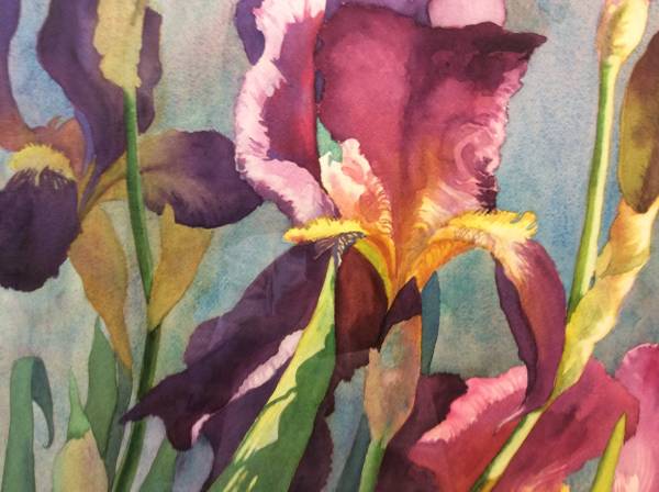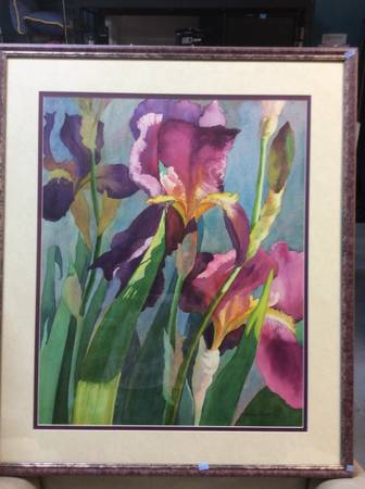 Original hand painted, signed, watercolor of Iris flowers. Painted by Nancy Baldrica, award winning water color artist, signature in lower right (see photos). Stunning deep purples, yellows, greens, and other colors. Vintage painting likely from 1980s, early 1990s. Larger piece, framed about 36" High x 30" wide. Professionally framed, painting is behind glass/ plexiglass.